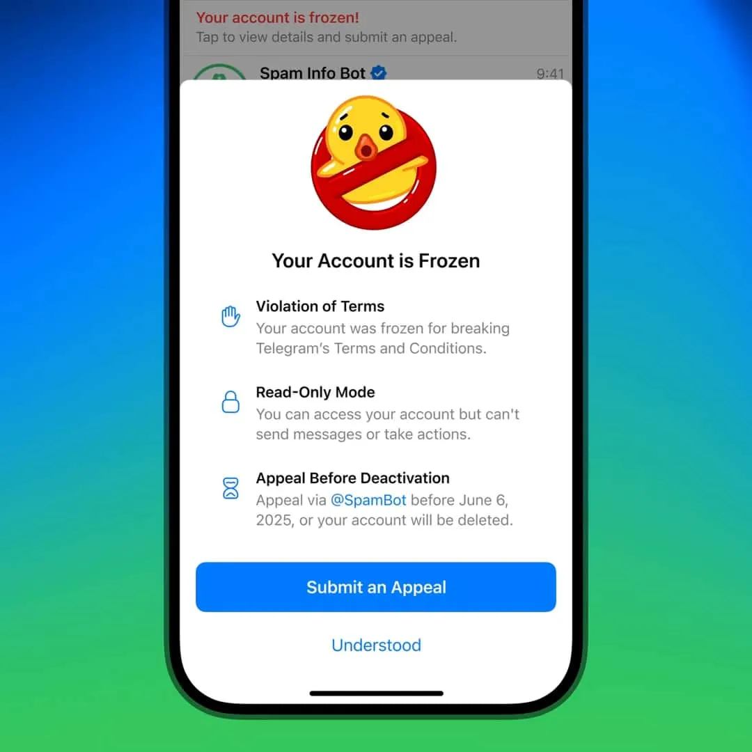 Thanks to robust moderation tools and user reports, people who attempt to send scam or spam messages on Telegram are quickly detected and banned. While these systems have an extremely low error rate, users are now able to appeal their ban from inside Telegram in case of a mistake.